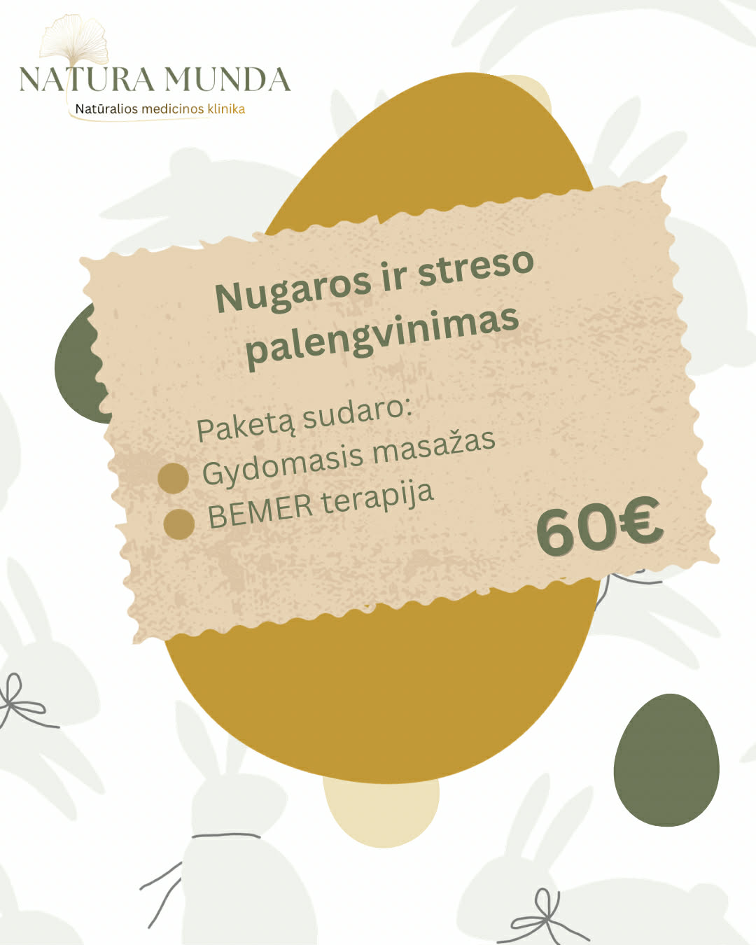 Įeina: – Gydomasis masažas, mažinantis įtampą ir skausmą – BEMER terapija, skatinanti kraujotaką ir atsistatymą