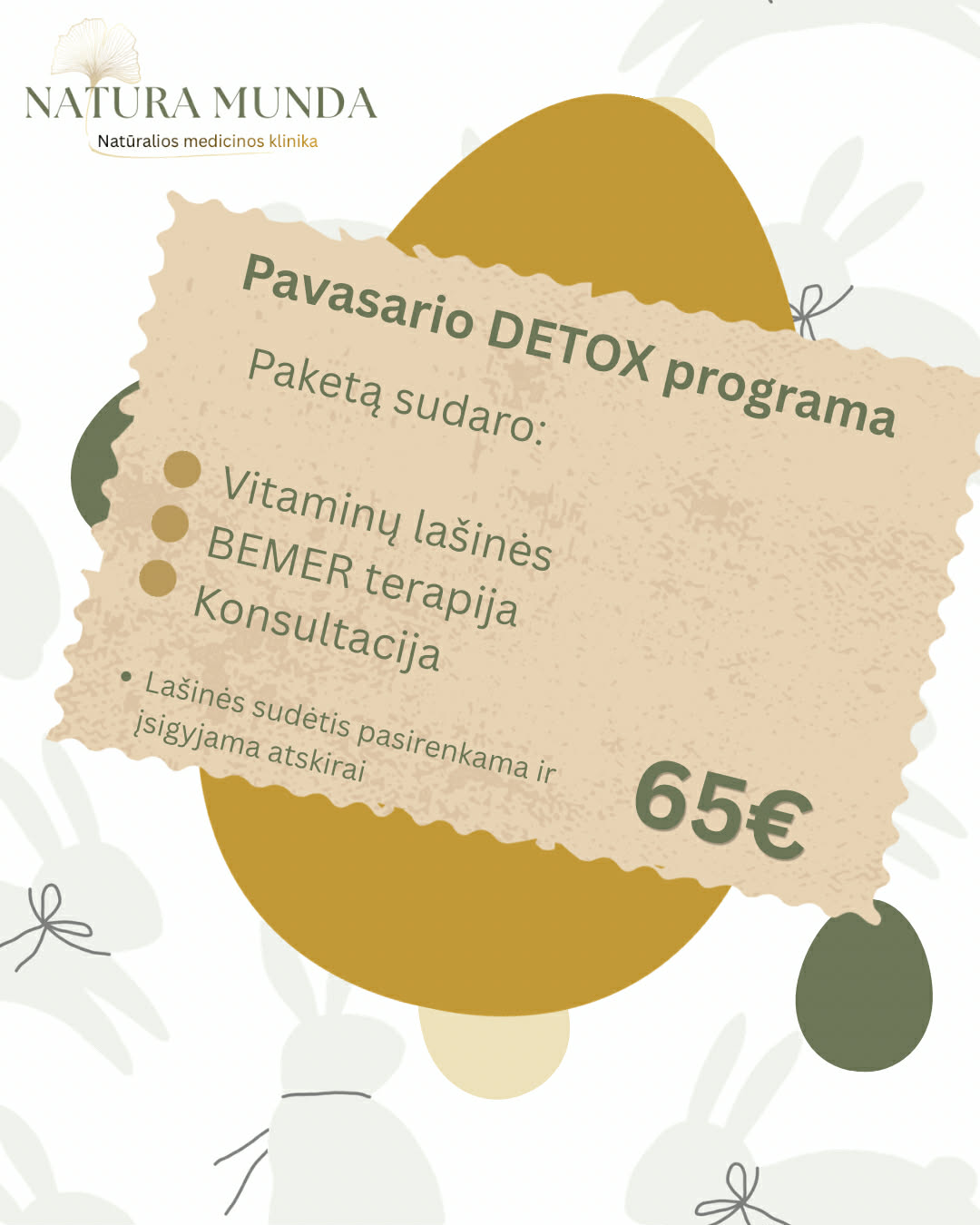 Individualiai pritaikoma natūralios detoksikacijos programa. Bus atliekamas organizmo detoksikacijai skirtų homeopatinių ir natūralių preparatų parinkimas. Remiantis diagnostikos duomenimis, gydytojas sudarys gydymo programą.